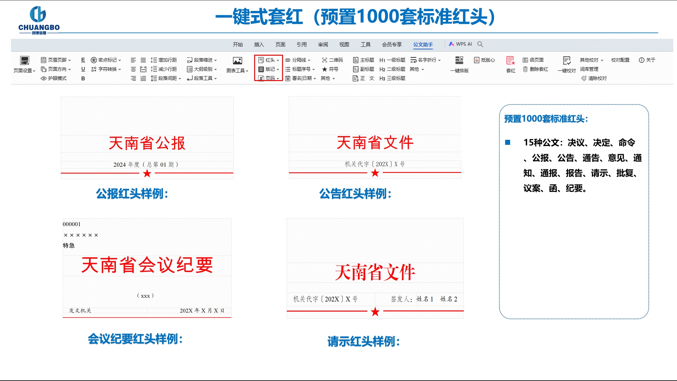 系统预置了15种格式的公文:决议、决定、命令、公报、公告、通告、意见、通知、通报、报告、请示、批复、议案、函、纪要。1000多套红头文件,方便用户能够快速的安装与使用。
