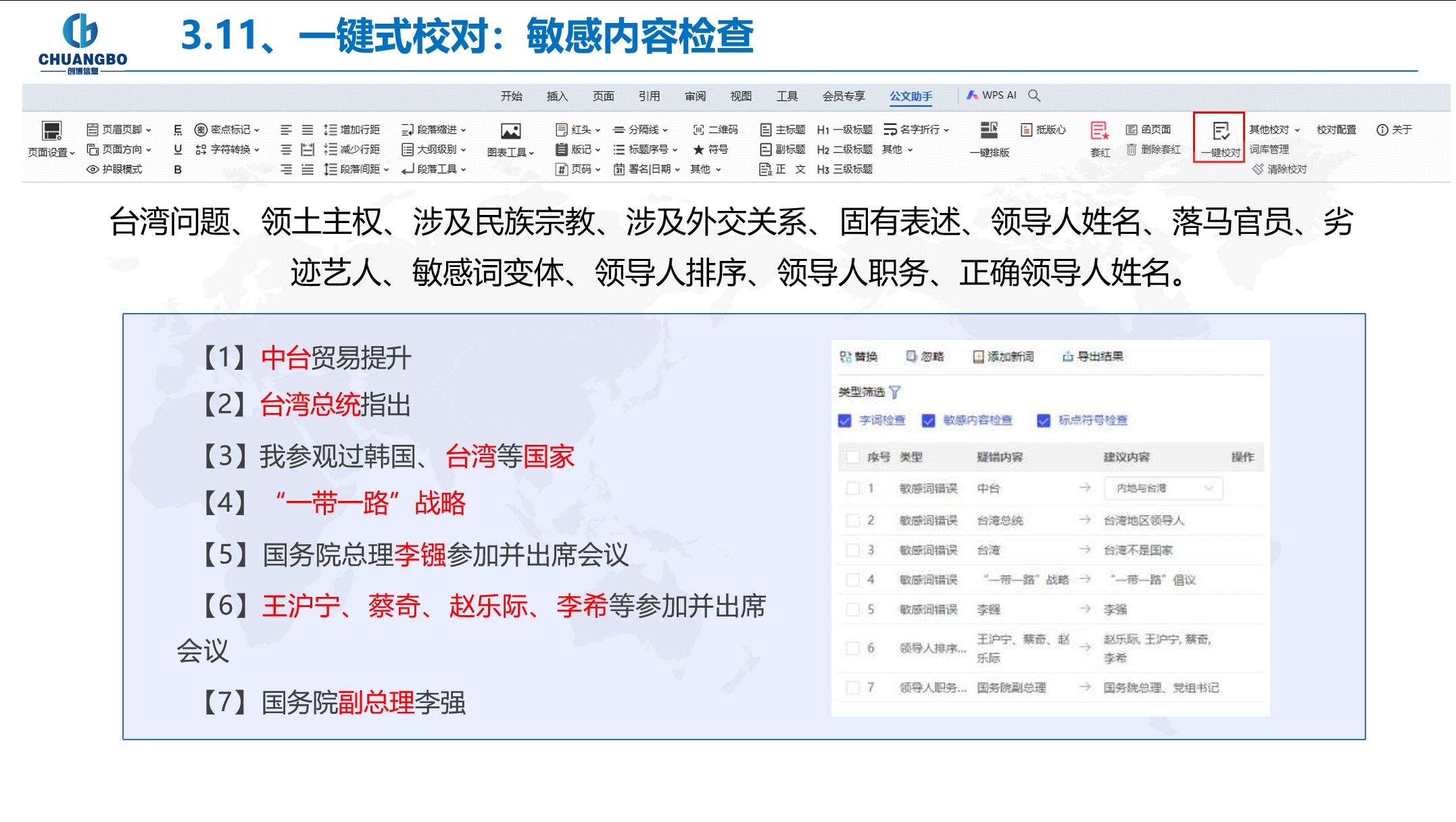 提供台湾问题、领土主权、涉及民族宗教、涉及外交关系、 固有表述、领导人姓名、落马官员、劣 迹艺人、敏感词变体、领导人排序、领导人职务、正确领导人姓名等敏感内容的检查。