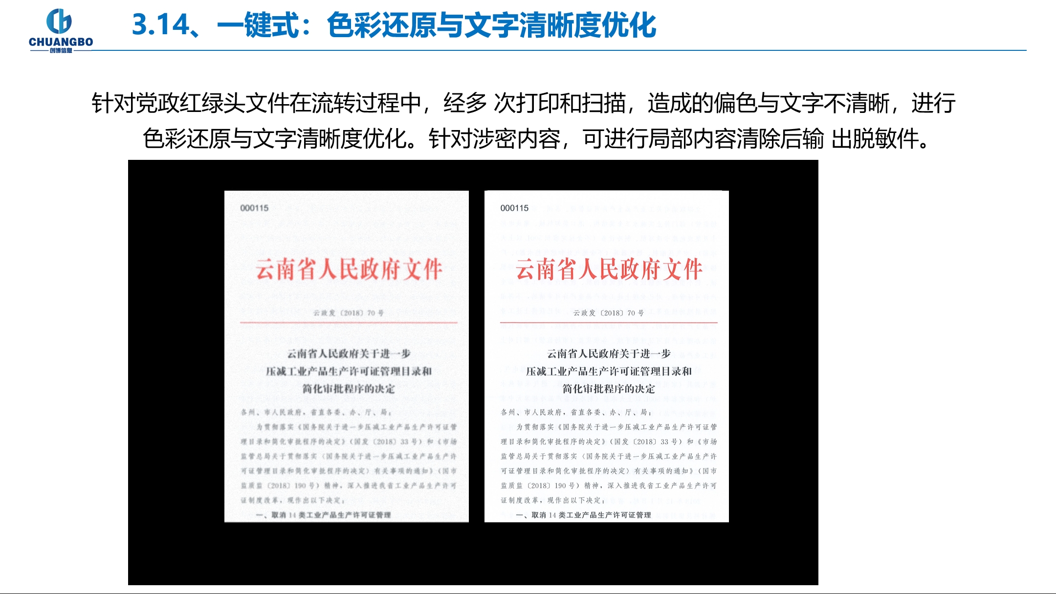 针对党政红绿头文件在流转过程中,经多 次打印和扫描,造成的偏色与文字不清晰,进行色彩还原与文字清晰度优化。针对涉密内容,可进行局部内容清除后输 出脱敏件。