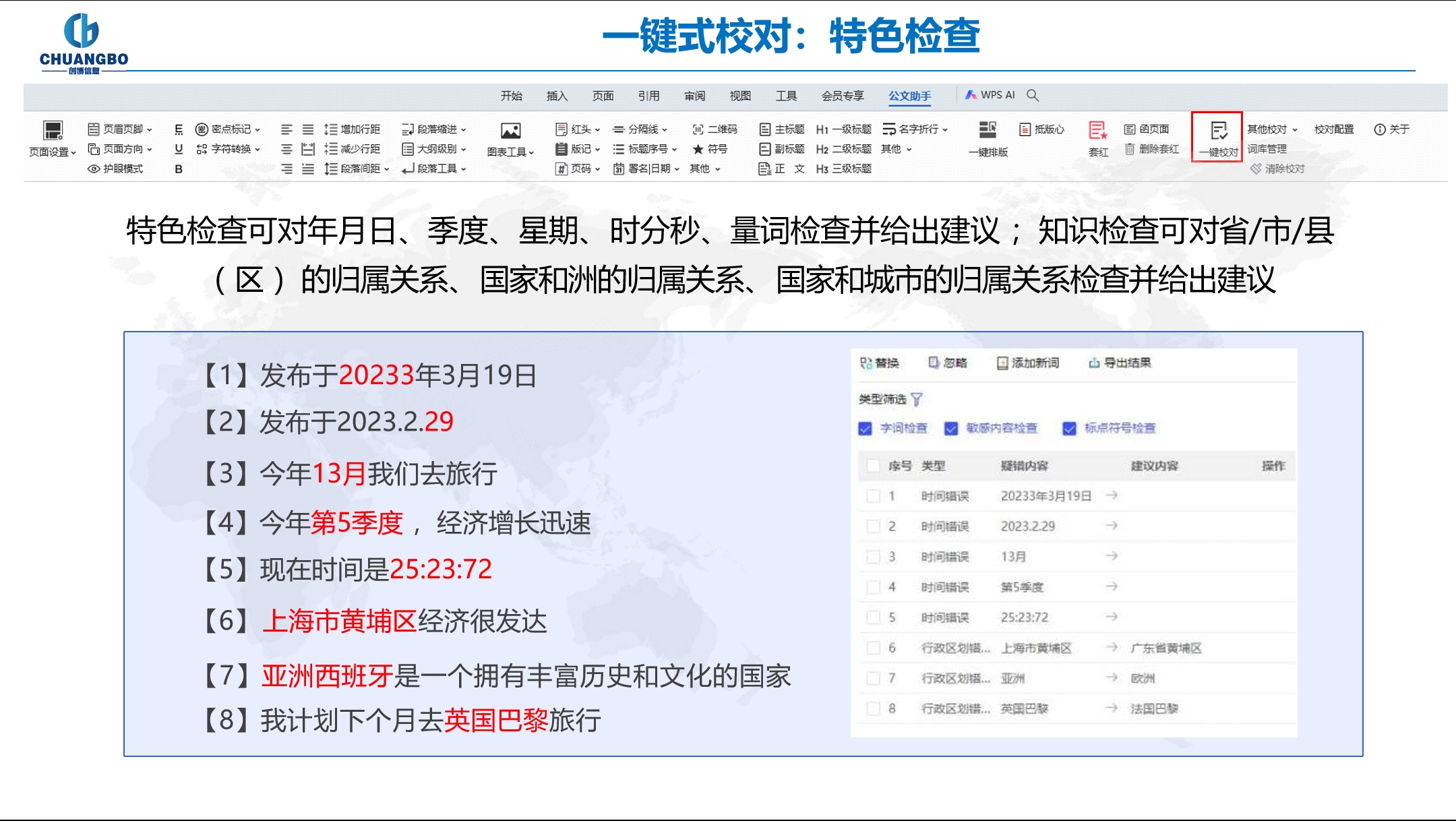 特色检查可对年月日、季度、星期、 时分秒、量词检查并给出建议 ;知识检查可对省/市/县 ( 区 )的归属关系、 国家和洲的归属关系、 国家和城市的归属关系检查并给出建议。