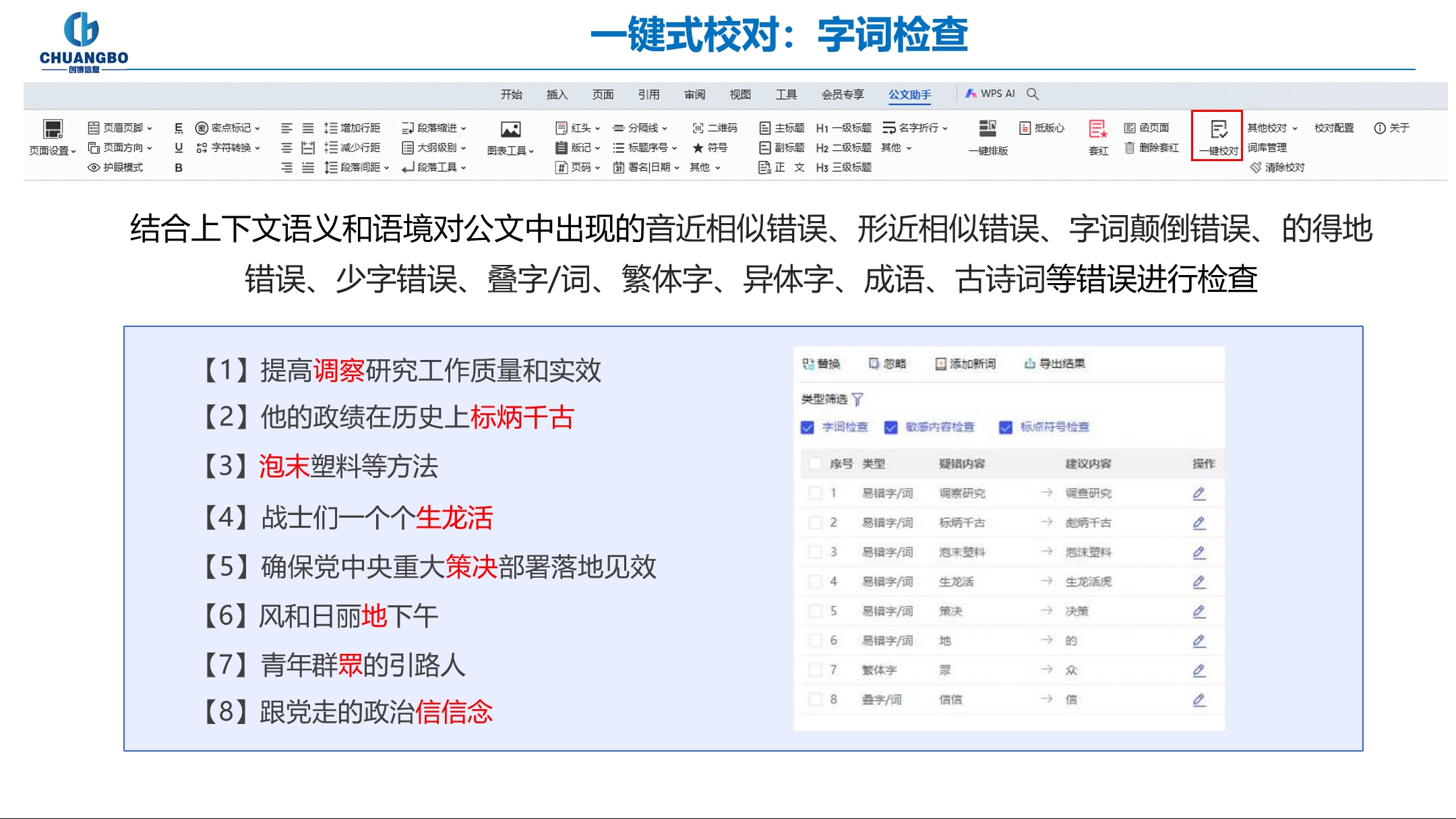 结合上下文语义和语境对公文中出现的音近相似错误、形近相似错误、字词颠倒错误、 的得地 错误、少字错误、叠字/词、繁体字、异体字、成语、古诗词等错误进行检查。