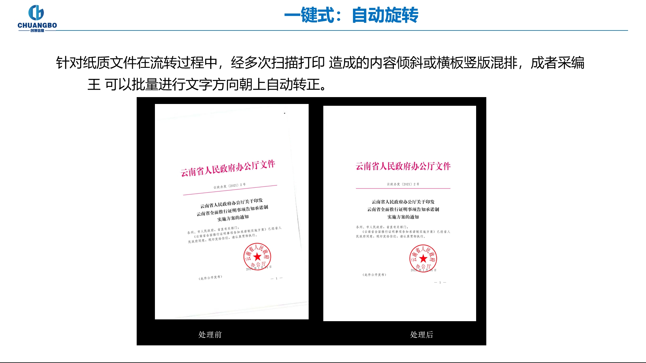针对纸质文件在流转过程中,经多次扫描打印 造成的内容倾斜或横板竖版混排,成者采编王 可以批量进行文字方向朝上自动转正。